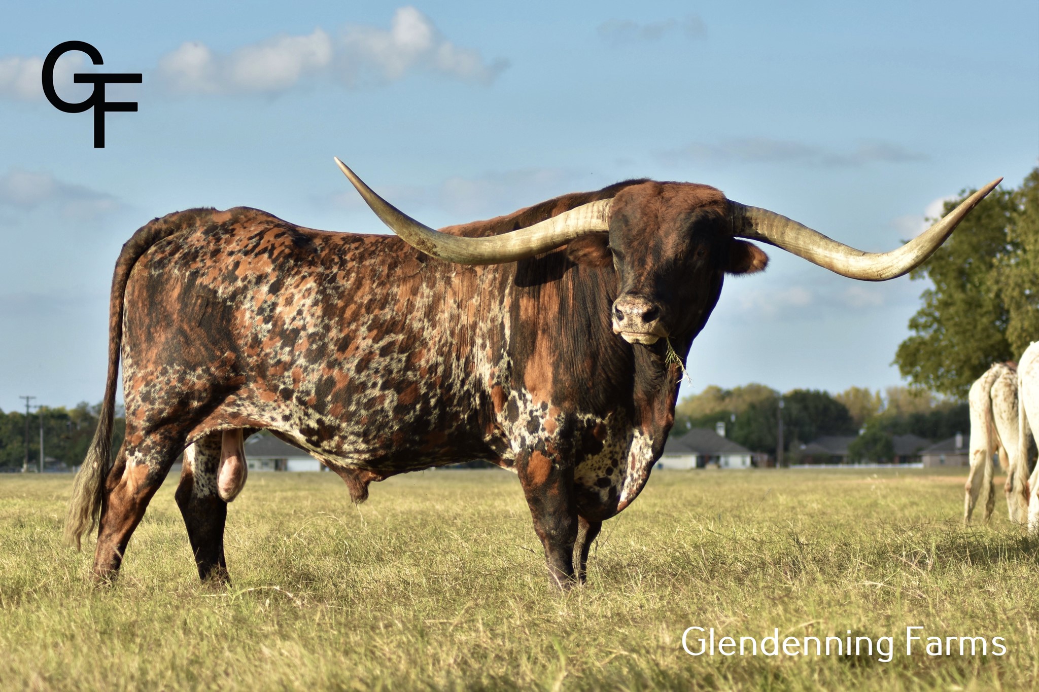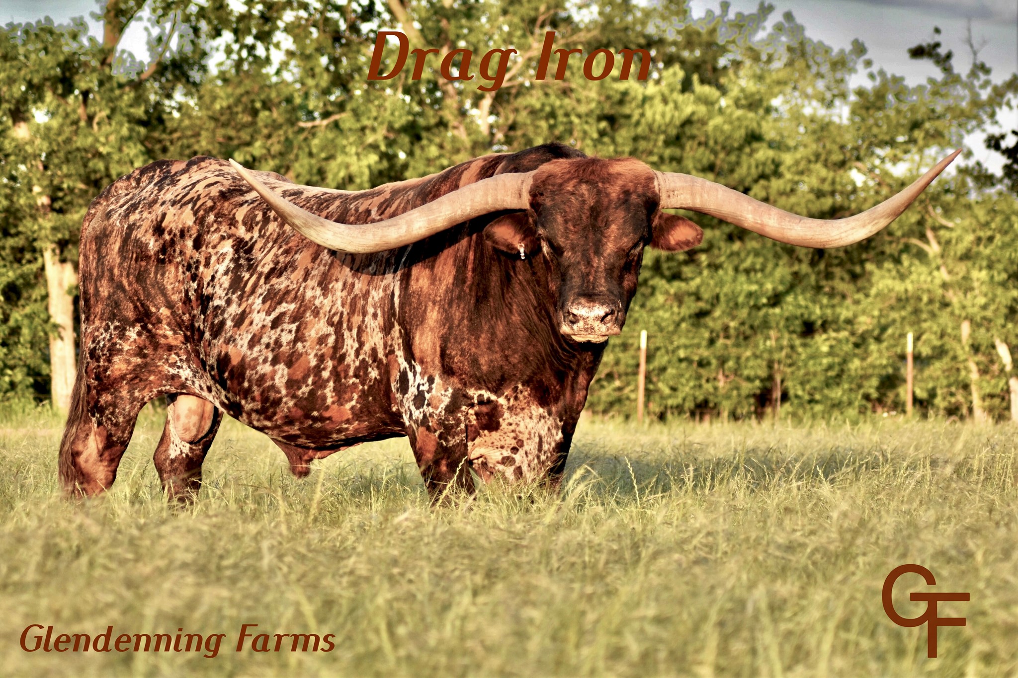 Deceased 6-23-2022. Drag Iron did a phenomenal job at Glendenning Farms as he not only added the structure of his over one-ton frame, but also added the beautiful butterscotch brindle coloring as well as his long massive swooping horns. He was a GENTLE GIANT with an amazing disposition.
